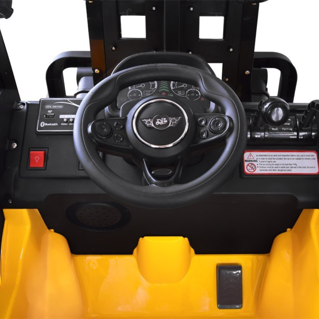 Dijete može samostalno upravljati vozilom pomoću volana i papučice, dok roditelji imaju potpunu kontrolu putem 2,4GHz daljinskog upravljača – od smjera kretanja, brzine pa sve do kontrole vilica. Sigurnost je na prvom mjestu zahvaljujući sigurnosnom pojasu, polaganom startu i kočnici koja se aktivira čim se makne noga s gasa.